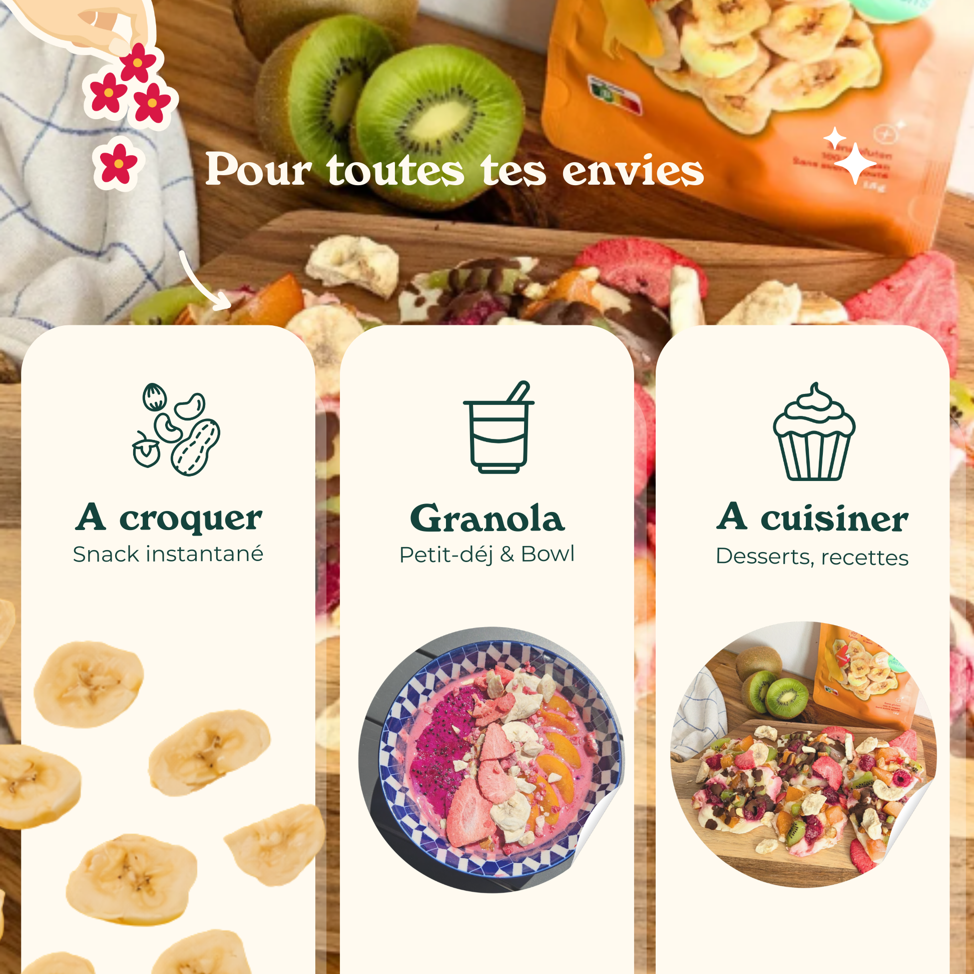 Four our crunchies fruits, enjoy a crunch or pimp your yogurts, granola, ice creams. For our fruityful water, multiply your creations, still , warm, cold, sparkling water, you choose.