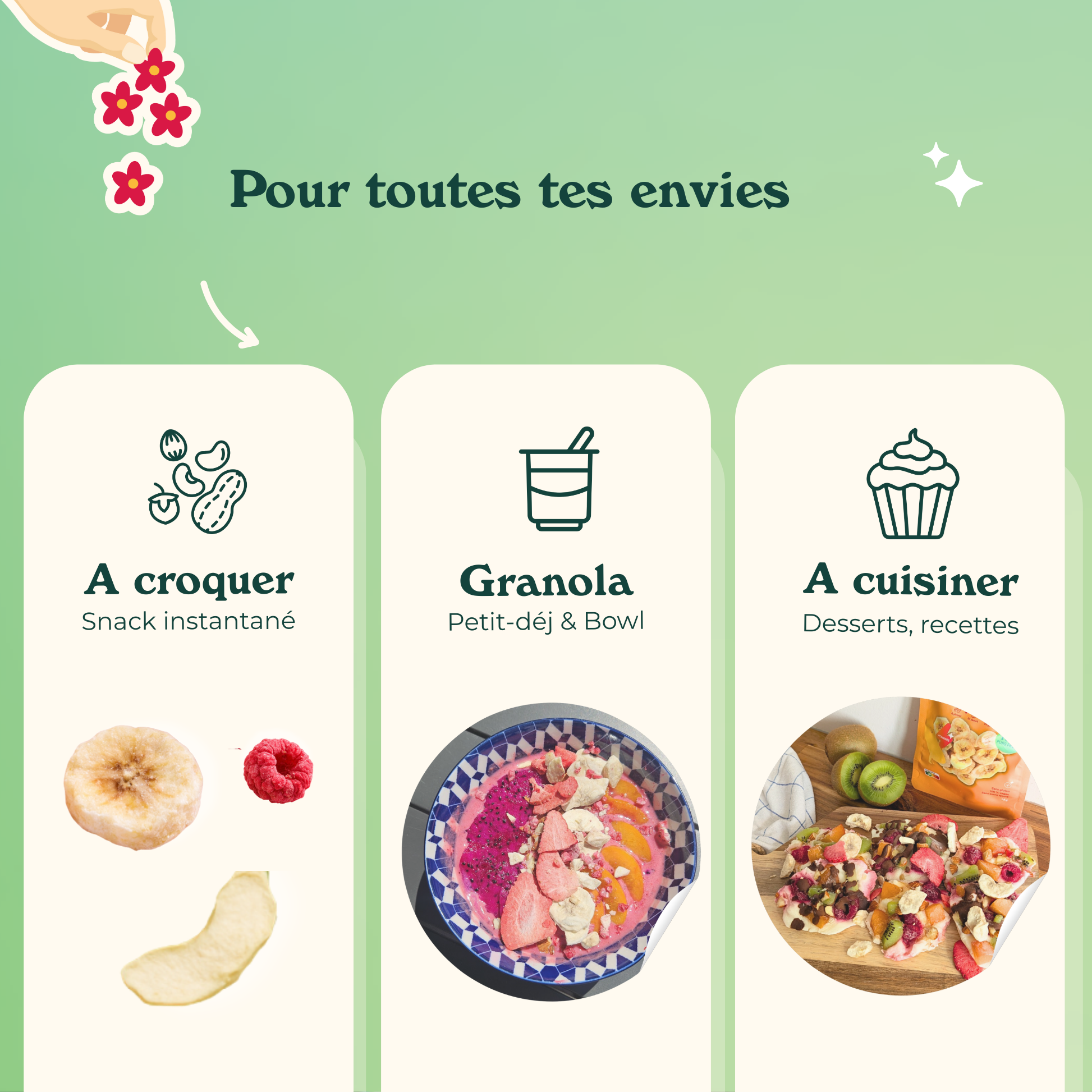 Four our crunchies fruits, enjoy a crunch or pimp your yogurts, granola, ice creams. For our fruityful water, multiply your creations, still , warm, cold, sparkling water, you choose.